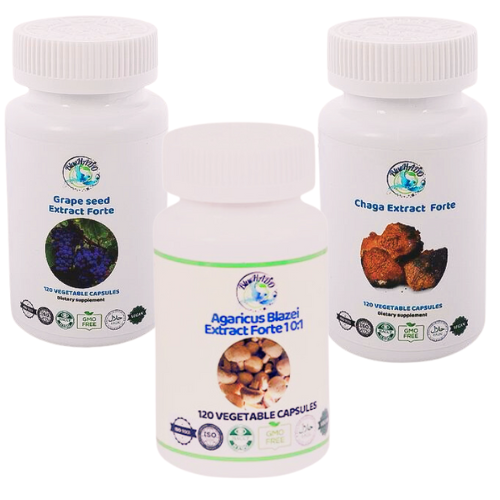 The combination of Chaga, Agaricus blazei, and Grape Seed Extract works through multiple, reinforcing pathways. Chaga and Agaricus deliver strong immune-boosting and anti-inflammatory effects, while Grape Seed enhances antioxidant capacity and supports circulation. Together, they: