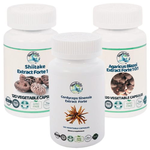 A natural dietary supplement formulated with concentrated 10:1 extracts of Cordyceps sinensis, Agaricus blazei, and Shiitake (Lentinula edodes), designed to support urinary tract health and local immune function. The ingredients work synergistically to combat urinary infections, reduce inflammation, and protect cells from oxidative stress. Contains 100% pure mushroom extracts with no excipients, additives, allergens, or artificial ingredients. Vegan, gluten-free, and sourced from certified organic farms.